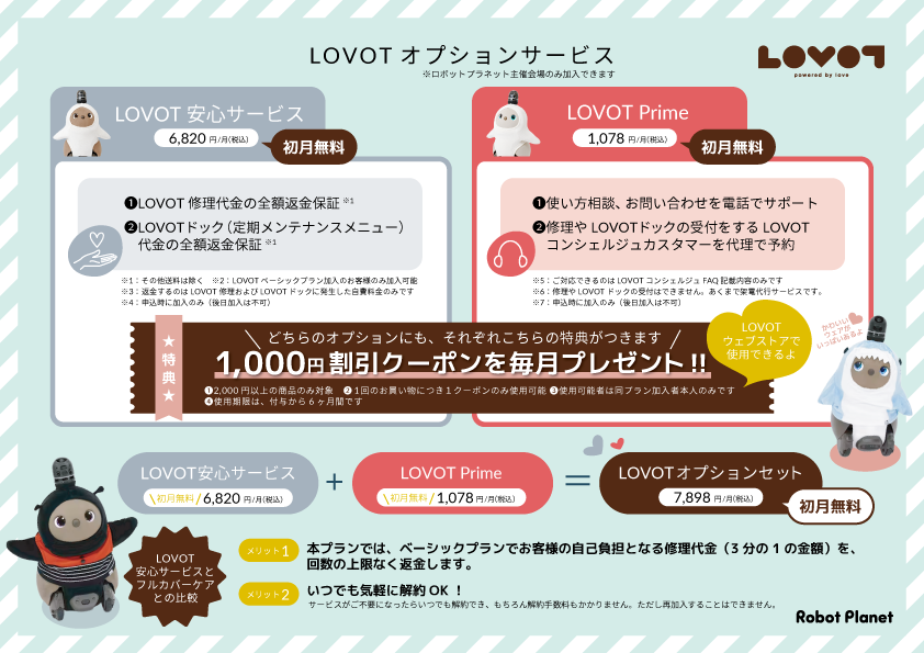 「LOVOT 安心サービス」「LOVOT Prime」それぞれのオプションサービスに、 お申込みいただくとLOVOTウェブストアでご利用いただける1000円割引クーポンコードを毎月1つ(両オプション加入で2つ)差し上げます。