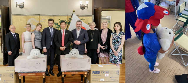 (左)ウクライナ避難民の「心の支援」のためパロを贈呈